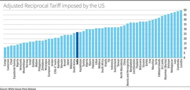 Moreover, an analysis of the adjusted reciprocal tariff imposed reveals a number of interesting patterns (see graph). First, in the top 41-50 per cent range, Asian countries like Sri Lanka, Myanmar, Vietnam, Laos, and Cambodia are present prominently.